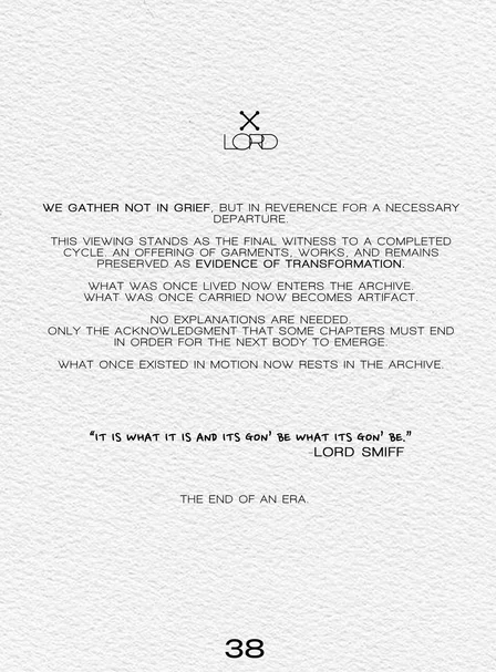 Life or Death: Ascension Service is an offering of preserved works, structural remains, and moments held in suspension. An environment where garments, objects, and presence exist between what was and what follows. An official farewell ceremony for Lord Smiff and celebration of Life or Death.